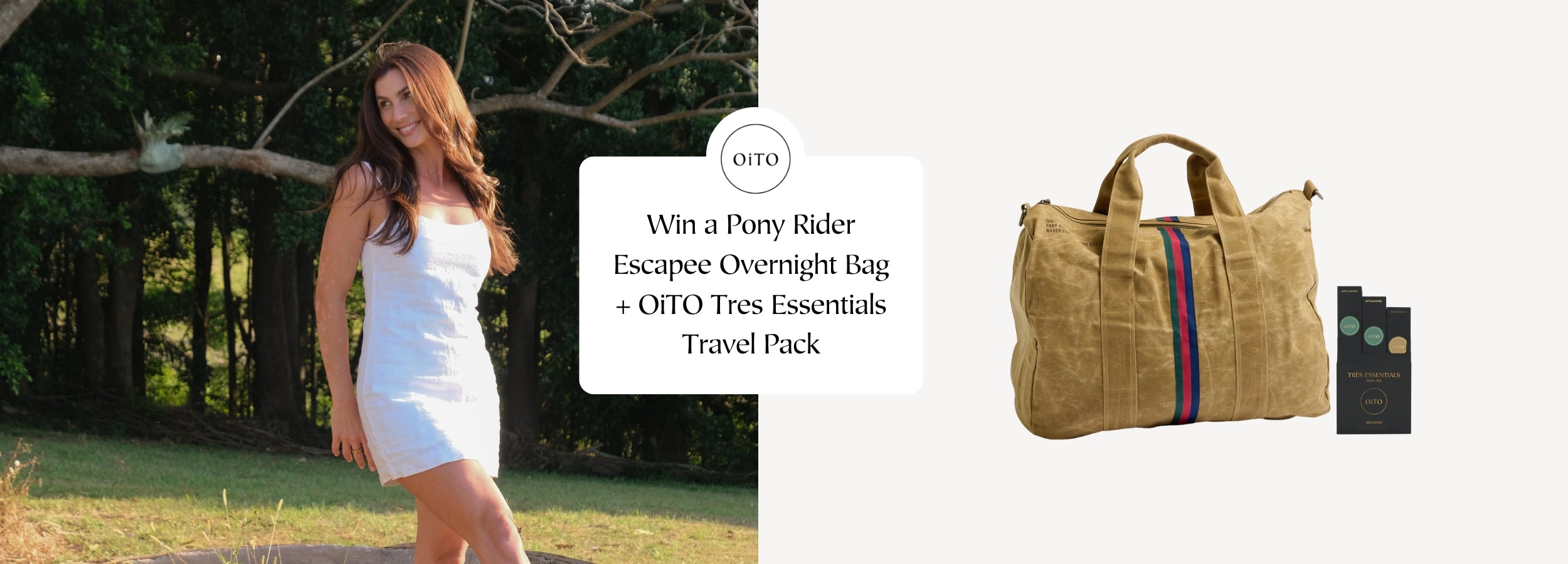 The prize is a Pony Rider Escapee Bag + OiTO Très Essentials Travel Pack valued at $300.